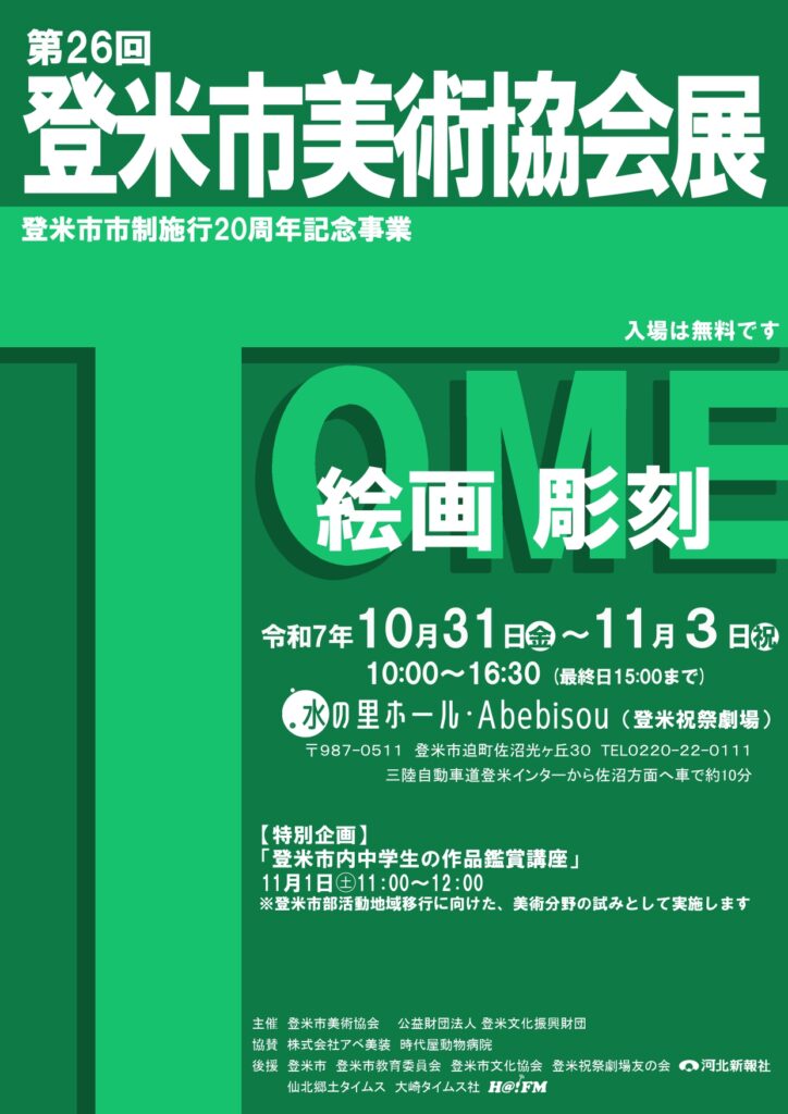 県内外の展覧会に出展し活躍している登米市美術会員による作品展示会。鑑賞する機会の少ない大型絵画や彫刻芸術をじっくりとご覧ください。11月1日(土)には、学生を対象とした作品鑑賞講座も開催します。